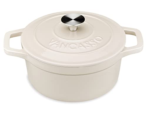 vancasso Cacerola Hierro Fundido 20 cm, 2 Litros Redonda Ollas de Hierro Fundido con 2 Asas, Horno Holandés Fundido Hierro para Cocina Estofado, Paella, Freír, Asar, Saltear -Creme Blanco