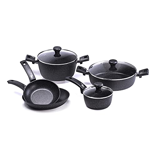 Moneta Etnea Juego de 8 Piezas: Sartenes 20 y 26 cm, Cacerola 1 Asa 16 cm, Cacerola Grande 24 cm 2 Asas, Cacerola 28 cm, Tapas 16, 24 y 28 cm con borde Inoxidable