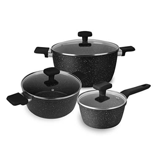 La Moustache - Batería de Cocina de 6 Piezas Antiadherentes de Aluminio con Capas de Titanio - 3 Ollas con 3 Tapas de Vidrio Templado - Aptas para Todas las Cocinas, Incluso Inducción (Onix)