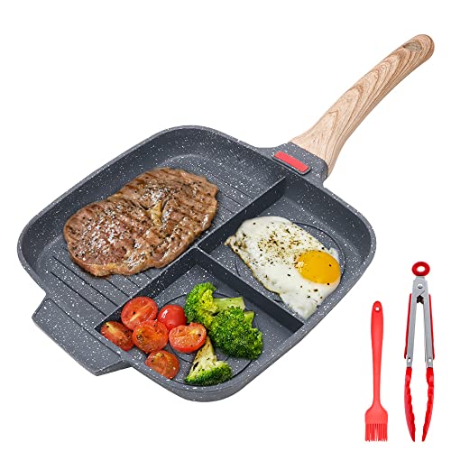 Bobikuke Sarten Parrilla 3 en 1, Grill Asador con Rayas de Desayuno Olla de Aluminio de Varias Secciones Sartén Cuadrada Antiadherente, Apto para Todo Tipo de Cocinas Incluido Inducción 28 x 24 cm