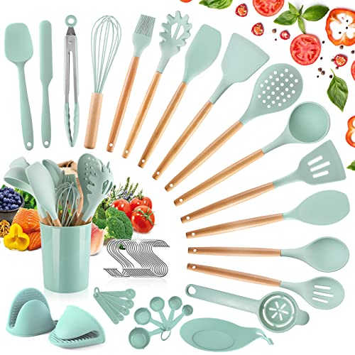 Berglander Juego de utensilios de cocina de silicona 38 piezas antiadherentes de madera con ganchos multiusos y estantes para utensilios (gris)